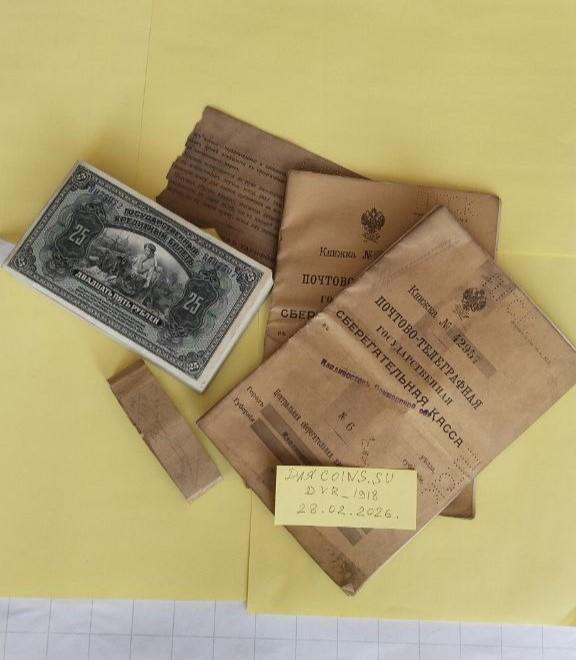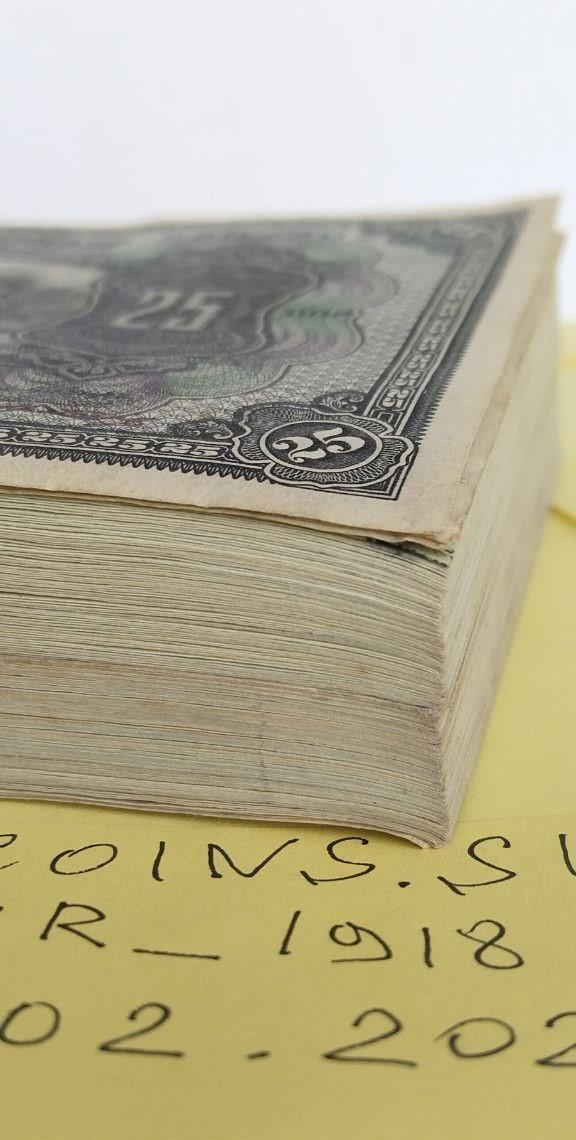 Комплекс: 25 рублей 1918 (ABNC) 173 шт., "Пресс", сберкнижки 1915г., лента с росписью и газета 1925г. Оценка