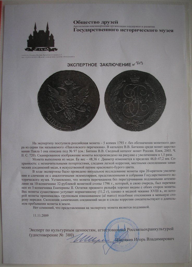 Здравствуйте уважаемые форумчане!На монету получено экспертное заключение.Завтра 13.11.09.пятак будет выставлен на аукцион на этом форуме.Желаю всем удачи.