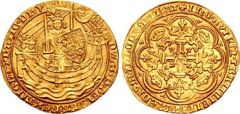 Нобль Эдуарда III, 1327-1377 гг. AV Noble (33мм, 7.69 г, 1ч). Додоговорный период, серия Е. Тауэр (Лондон) монетный двор. Отчеканен в 1354-1355 гг.