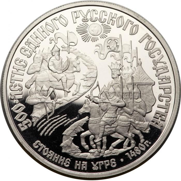 150 рублей 1989 года, СССР, "500 лет единому русскому государству - Стояние на реке Угре", 15, 55 грамм платины 999, Тираж 16 000 штук ЛМД.