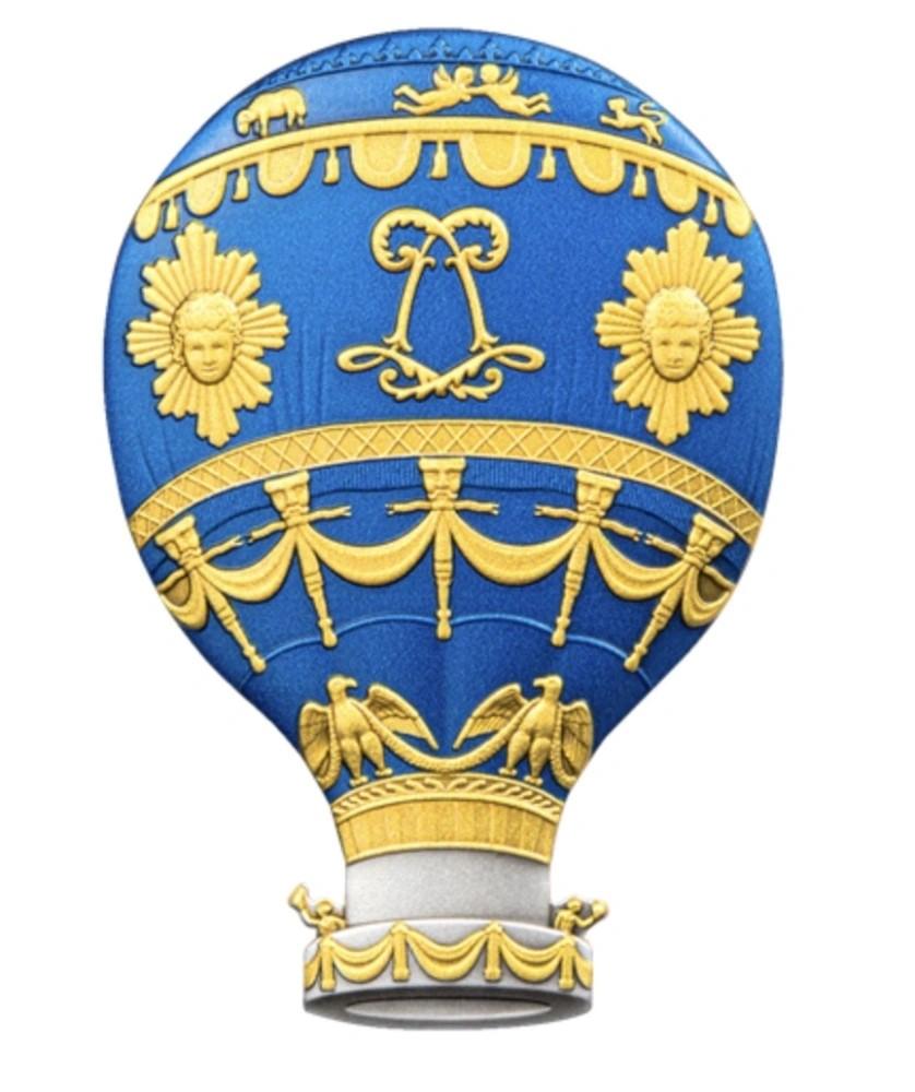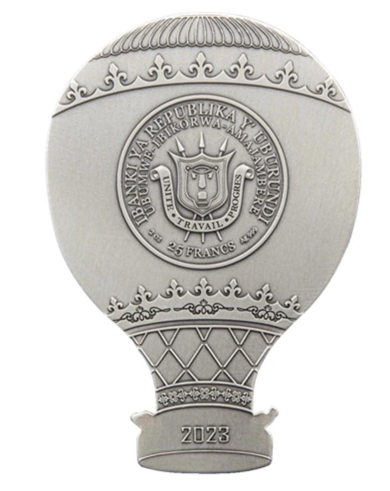 25 франков 2023 года, Бурунди, "Шар братьев Монгольфье", 2 тройские унции серебра 999, Тираж 1783 экземпляра.