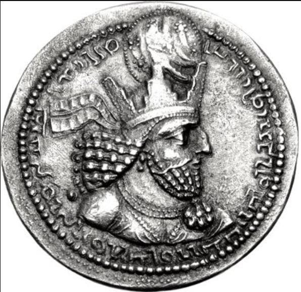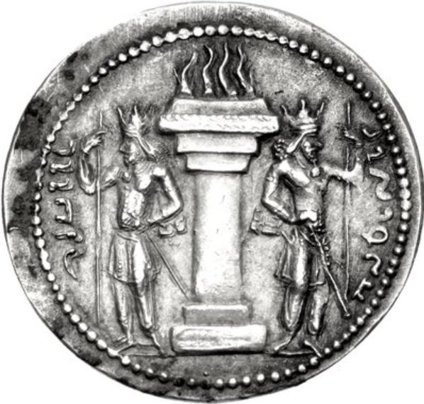 Сасанидская серебряная монета, драхма Шапура I с коронованной и богато украшенной головой царя на аверсе и огненным алтарём с двумя служителями на реверсе. Отчеканена в Ктесифоне ок. 240—244 гг. 28 мм, 4,35 гр.