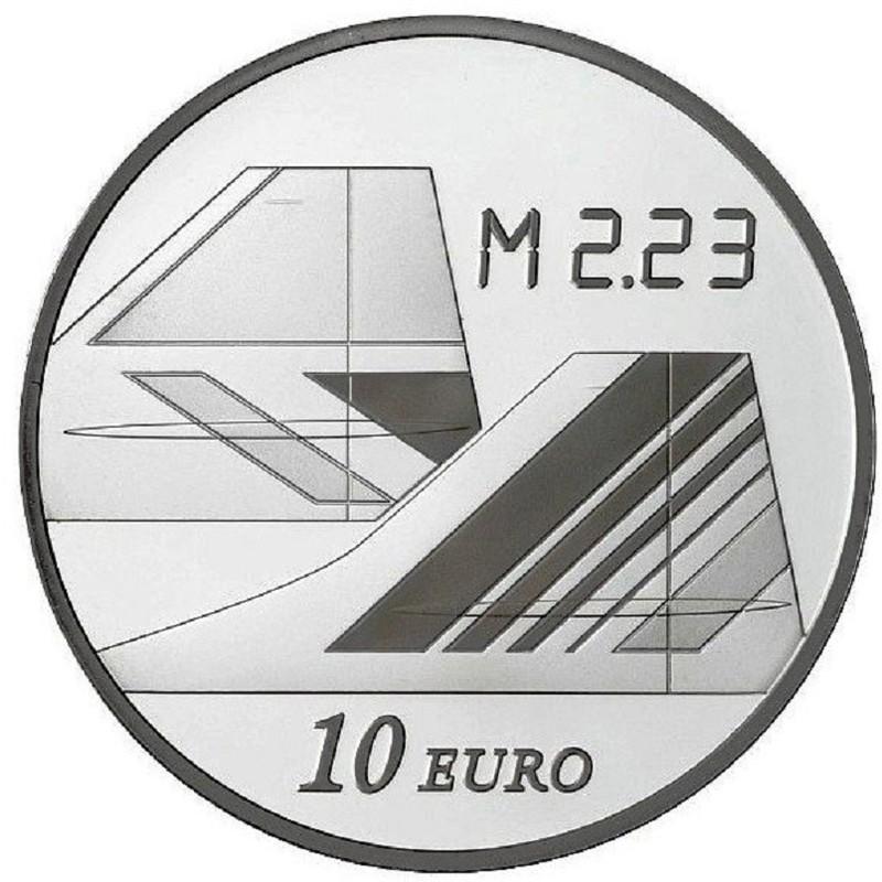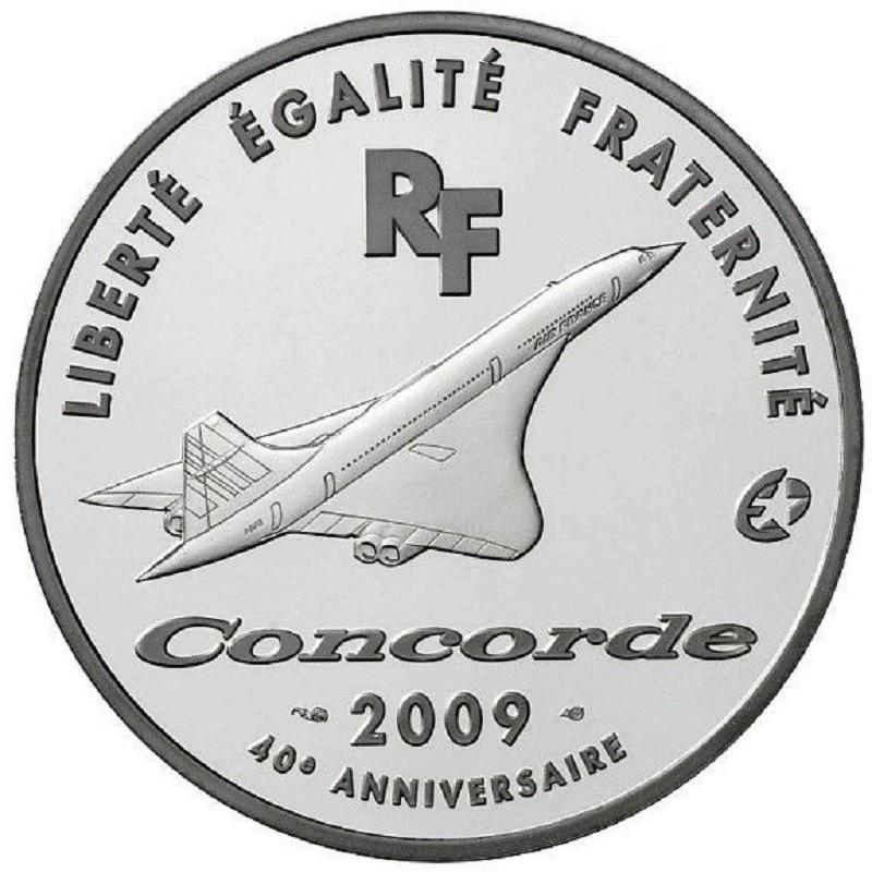 10 евро 2009 года, Франция, "40 лет первого полета Конкорда", 22,2 грамма серебра 920, Тираж 30 000 штук.