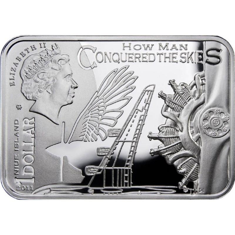 1 доллар 2011 года, Ниуэ, "Самолет братьев Райт", 28,28 грамм серебра 925, Тираж 6 000 штук.