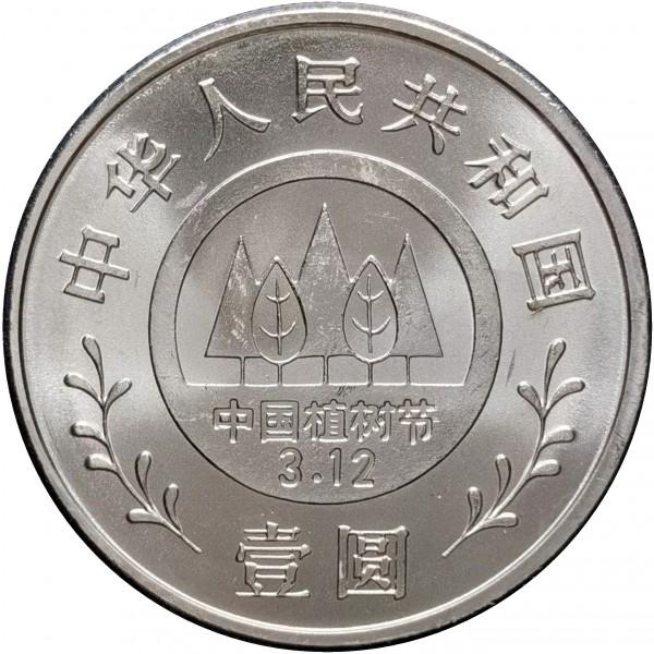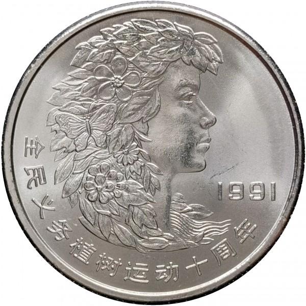 1 юань 1991 года, Китай "Фестиваль посадки деревьев", Сталь с никелевым покрытием, Тираж 10 000 000 штук.