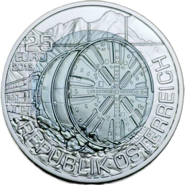 25 евро 2013 года, Австрия, "Строительство тоннеля", 16,5 грамма, Биметалл: центр - ниобий, кольцо - серебро 0.900, Тираж 65 000 штук.