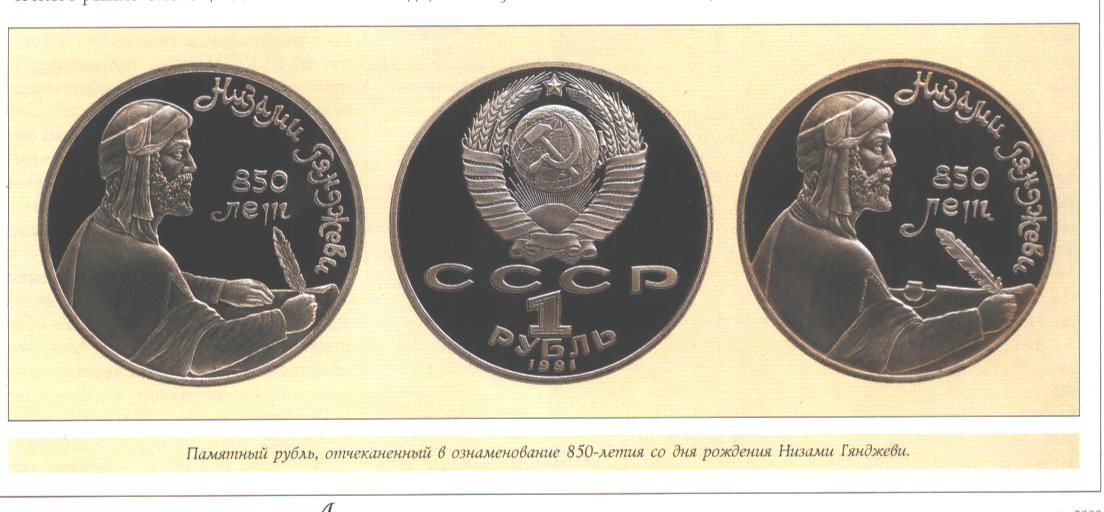 А я где - то в середине 1990 - ых годов на площадке около магазина "Нумизмат" видел еще один вариант юбилейного рубля "Низами". На нем портрет был совсем другой, иной разворот туловища, под другим градусом. Давал хозяину аж 300 долларов - по тем временам это были просто бешеные деньги, тогда примерно столько стоили два хороших рубля Петра I. Но он монетину не продал.