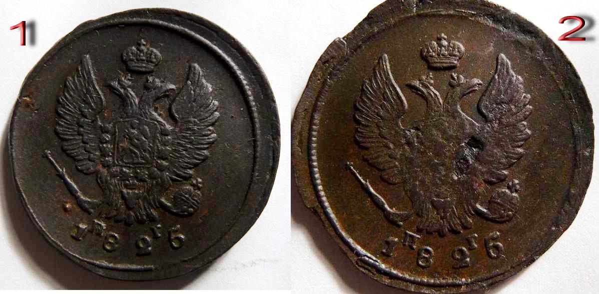 на 1-ой вроде как и крест державы ближе к крылу и нижняя гаста в букве
