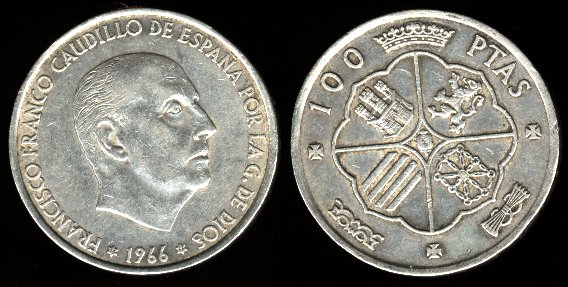 Каудильо у него уже есть, увы. С него можно сказать и началась темка (ну, еще парагвайский Стресснер и Сталин). Причем это вроде единственный Франко в серебре. Зато это одна из последних в мире серебрянных монет для обращения, чеканилась с датой 1966 в 1966-70 г.г. Позже были вроде только ФРГ, Австрия, Франция и Швеция.