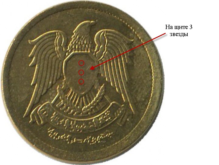 Фото, к сожалению, сделать не могу. Это, похоже, 10 миллимов (Арабская Республика Египет). Но у меня на монете, на щите есть три звезды.