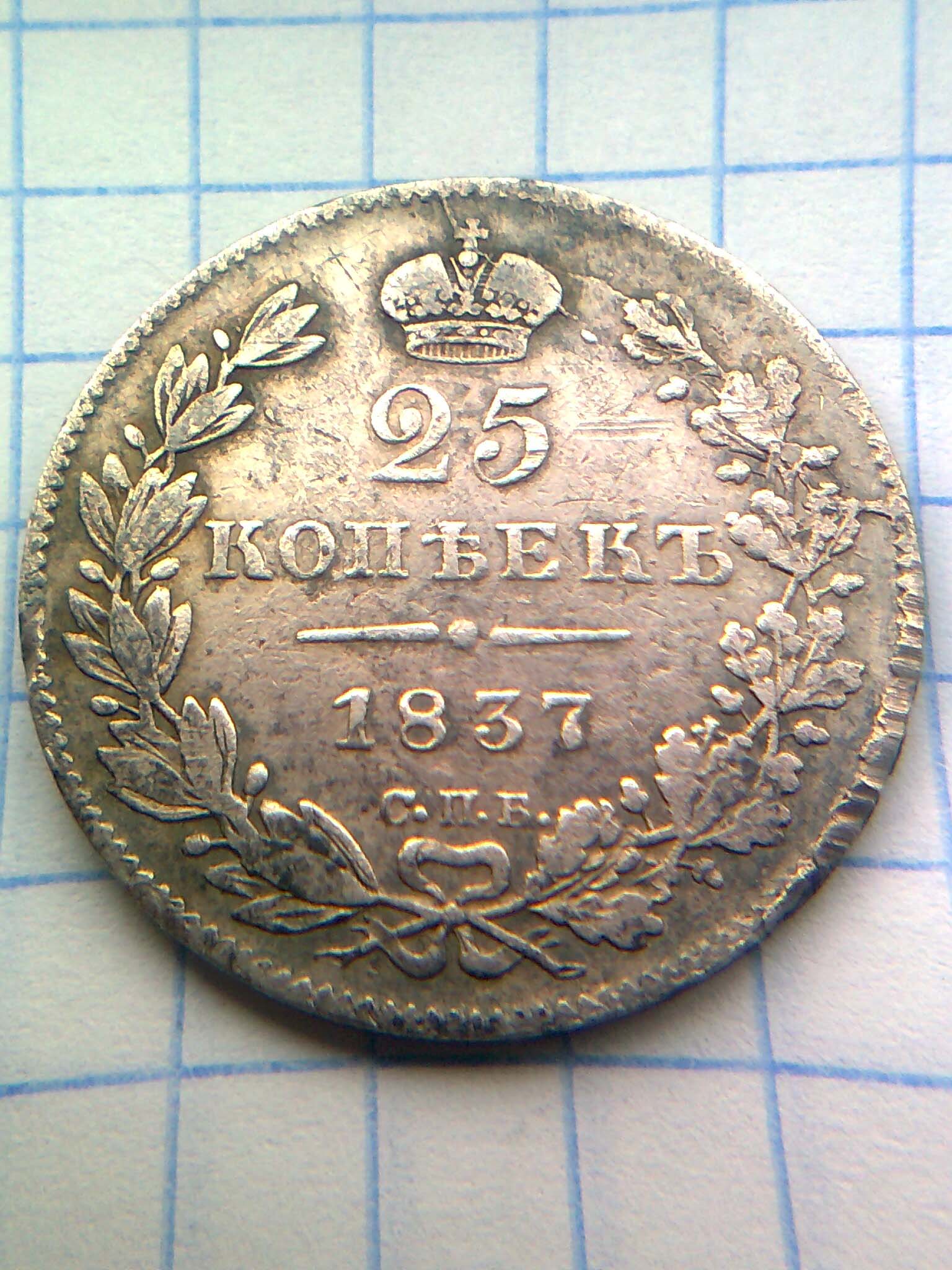 25 копеек 1839 (относительно недолго была в обороте; непрочекан буквы "К" в "КОПЕЕК"):