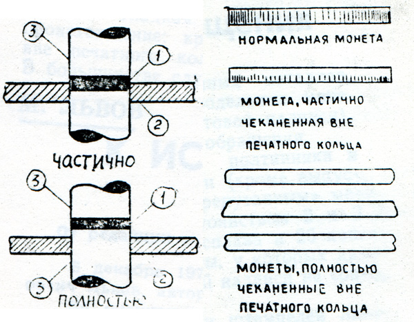 [/quote Здорово сказано! В дополнение хочу сообщить, камрад с Виолити подсказал ссылку, http://coins.su/forum/index.php?showtopic=68869&st=0&p=676100&; которая , как мне кажется , проливает свет на возможный механизм образования складок металла на боковой поверхности монеты. Обсуждалать на ЦФН медноникелевая монета СССР и приведен рисунок, показывающий какие образования формируются на боковой поверхности монеты, при чеканке монеты выше или вне кольца. Нижний пример в рисунке ( вне кольца) аналогичен характеру смятия металла на боковой поверхности моей монеты, хотя и менее заметны. Но если и на медноникеле это заметно, то на более мягком металле, которым является серебро, складки будут более выражены. Я лично так считаю. С ув.