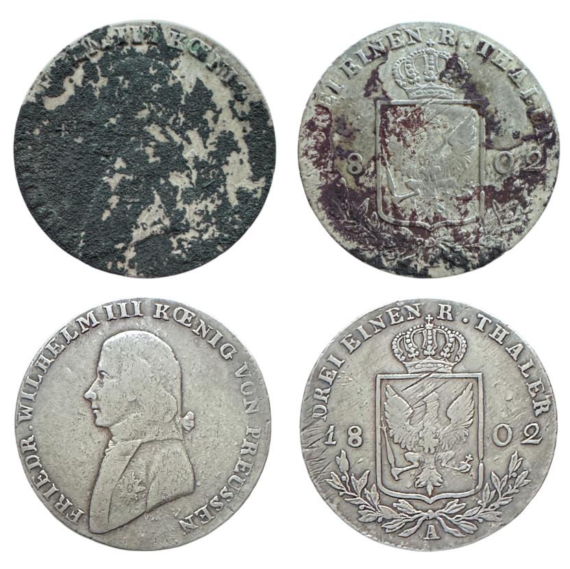 И если интересно, вот пример реставрации 1/3 талера. Немного упрощу пример, покажу только аверс. Монета также из огня, но не сильного. По итогу корка в основном из закиси меди, окиси меди, оксида серебра и минеральных включений. За счёт более низкой пробы серебра (в сравнении с полтинником советов и полтинником Николая II) и более равномерной коррозии поля, удалось немного привести монету в порядок, насколько это было возможно: