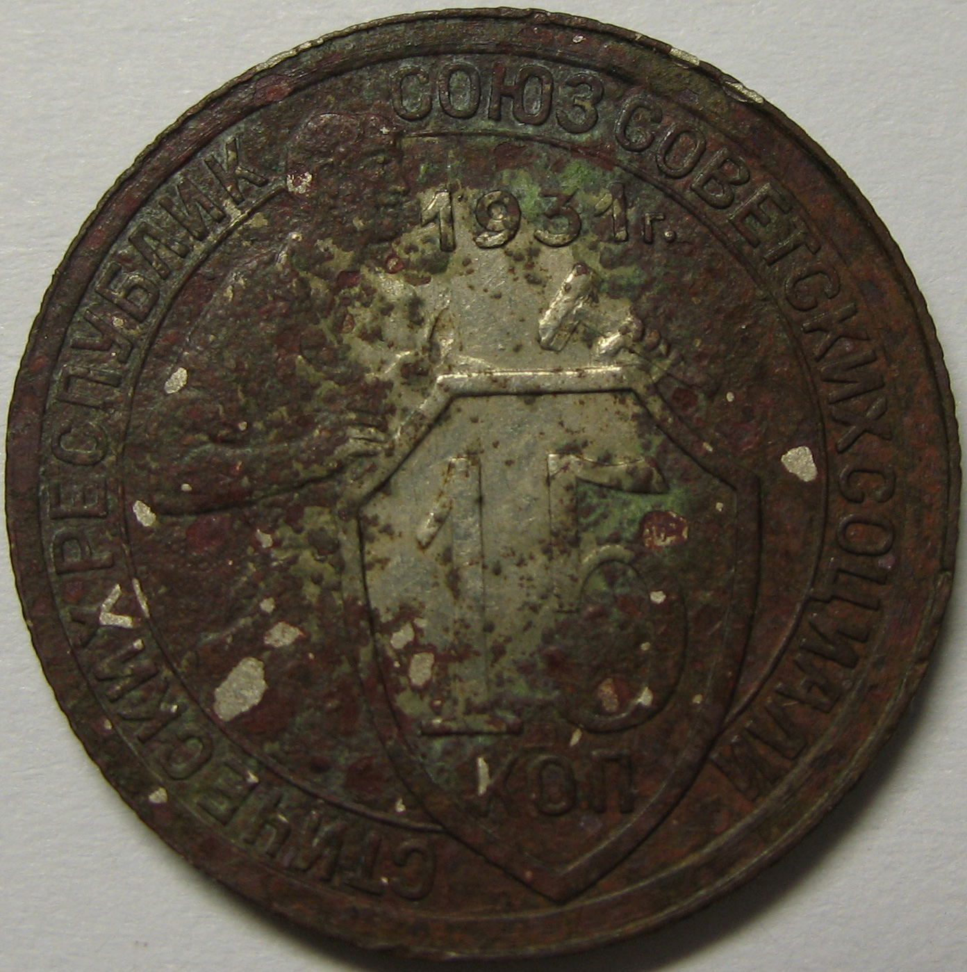 Приветствую всех.На фото монета 15 копеек 1931 года с небольшим браком, аверс и реверс под небольшим углом относительно друг друга.